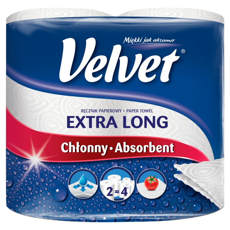 Ręcznik Velvet Czysta Biel Najdłuższy to gruby ręcznik produkowany z dwóch warstw idealnie białej bibułki, która dzięki ulepszonej technologii tłoczenia perfekcyjnie pochłania wilgoć. Produkt posiada świadectwo PZH do kontaktu z żywnością, dlatego idealnie nadaje się do osuszania owoców, przygotowania posiłków, gotowania i pieczenia. 2 rolki ręcznika najdłuższego odpowiadają 4 rolkom standardowego ręcznika.